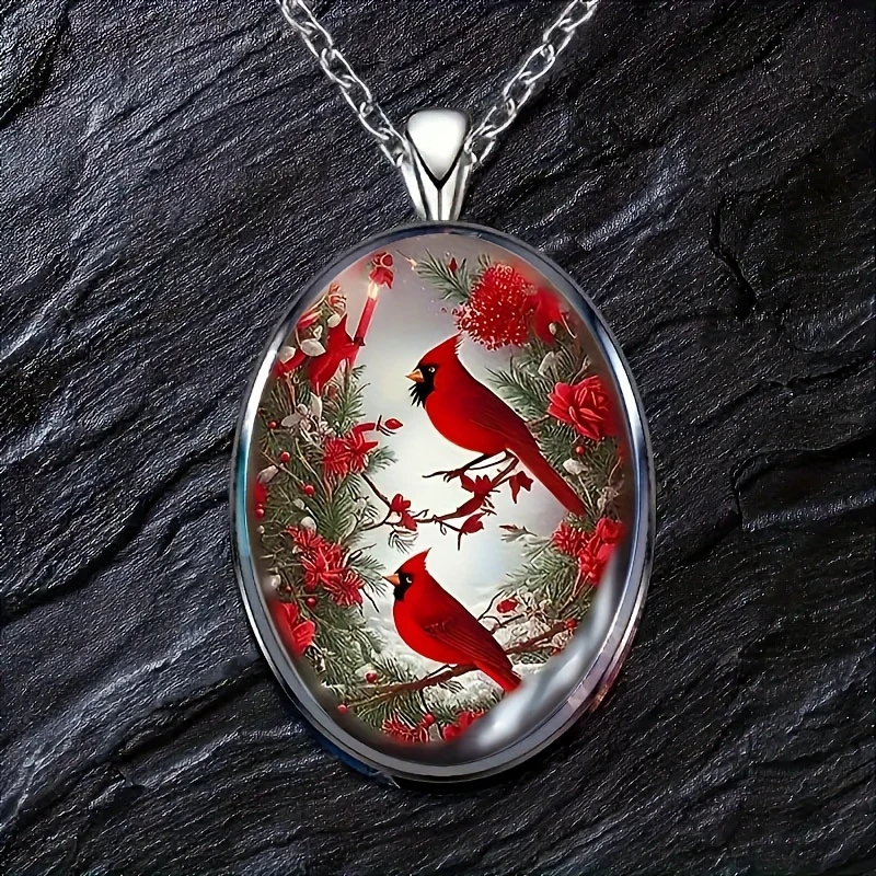 Bird Pattern Oval Glass Pendant Necklace