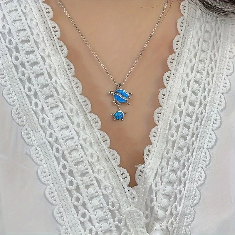 Charming Mother-Youngsters Turtle Pendant Necklace - Silvery Alloy, Perfect Gift for Girls
